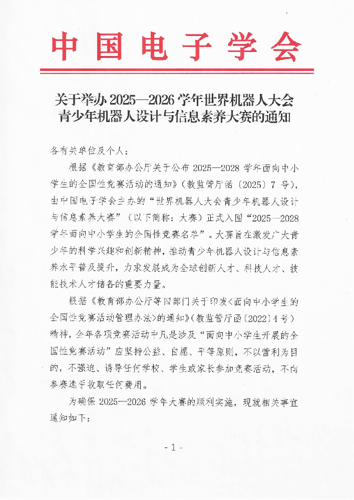 关于举办2025-2026学年世界机器人大会青少年机器人设计与信息素养大赛的通知